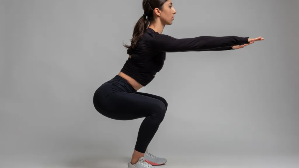 Uitvoering: Voetpositie iets breder dan schouderbreedte. Tenen wijzen iets naar buiten. Heup gaat iets naar achteren en dan zak je door de knieën tot ongeveer 90 graden. (alsof je op de stoel gaat zitten.) En kom weer omhoog.